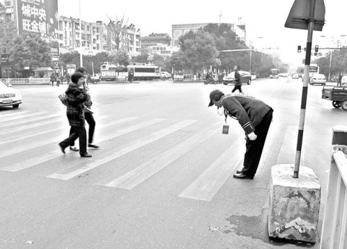 经多方寻找,记者于前日找到这位鞠躬老人。这位“鞠躬老人”叫吕军海,今年63岁,是襄阳的一名“公共文明引导员”,这种以“鞠躬劝阻路人闯红灯过马路”的日子,已经坚持半年了。退休前,老人是该市的一位交警。