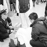 昨日下午,一位年约七旬的老人走进地铁2号线雍和宫站,突然“咕咚”一声栽倒在地上。站台上的工作人员寻声望去,发现倒地老人后,冲过来,蹲下身子询问老人的情况。