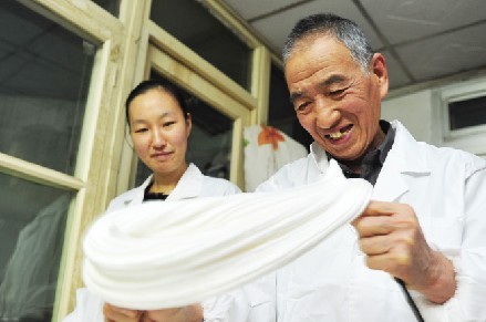马学文的爷爷是他从事糖果事业的第一个老师,从13岁开始马学文就开始学习熬糖砂板糖、硬质糖果、棒棒糖,天津小人酥,做好后在天津估衣街摆糖摊批发零售。到了18岁他开始创业,在开始阶段技术和销售齐头并进,两年后便有了自己的工厂,厂名叫“天津義利糖果工业社”,生产的糖果销往天津、北京、山西临汾、太原等地,生意越做越大,直到公私合营。进入工厂的马学文又学习了许多其他糖果的制作技术,比如各种软糖、巧克力、酒芯糖、汽水糖、核桃糕等独门绝技,并研制出独门绝技琥珀果仁、核桃、花生,再加上家族祖传的传统药糖、72种口味的酥崩豆又名72口酥、天津小人酥等,可以说马学文的技术堪称一绝。后来马老又自制研发了能吹泡的泡泡糖、口香糖、水晶果、冰激凌粉等。马学文如今唯一的传人是外孙女孙娟。据了解,像马学文这样的老技术人全国已经不多了,这些年很多传统技术已相继失传。(史嵩 摄)