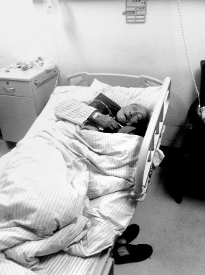 这是一间位于老年医学楼的病房,病房里只有一张病床。昨天晚上6点,王金贵刚刚挂完水,睡得正香。史秀梅的小儿子祁立清坐在旁边的一处躺椅上,翻看着昨天的《现代快报》。