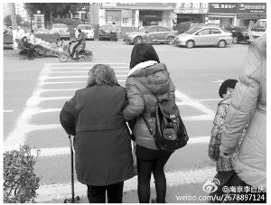 女孩挽着老人过马路 读者供图