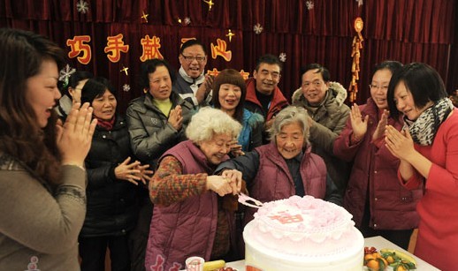 在众人为两位老人准备的蛋糕上,大红色的“福”字特别显眼,就在她们携手切蛋糕的瞬间,周围响起了“幸福长寿”的祝福声和让人听着心里觉得暖暖的掌声。