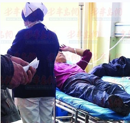 1月17日上午10时50分许,在位于胶州路的市立医院急诊室,记者见到了受伤的刘老先生。他躺在担架床上,右手的位置包裹着很多衣物,但是鲜血还是不断渗出,而医护人员正在给老人清理伤口。“老人手上的伤很重,不仅有骨折的情况,而且手筋也被割断了,所以为了老人的伤情考虑,最好是转到401医院进行治疗。”记者刚到医院,就听到医生向家属说道。