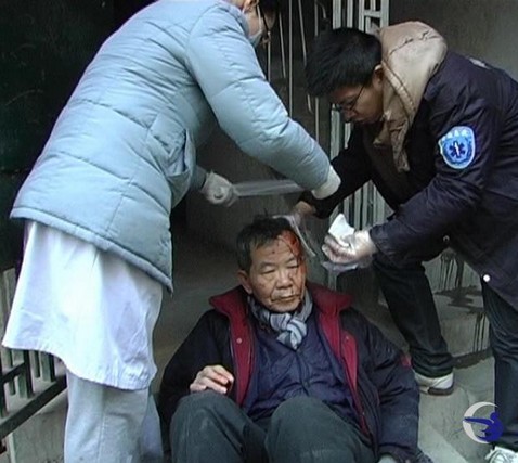 就在老人孤立无助的时候,附近毫不相识的陌生人向老人伸出了温暖的援助之手。笔者赶到现场时,老人已被楼下的居民扶坐在过道上,头上脸上流满鲜血,地上流了一大滩鲜血和汤水,帽子和布包也摔落在一旁,市民刘先生正在为老人联系家人。居民们表示,当时老人准备从一楼上二楼的,不知道怎么了,就从二楼一直滚到一楼。居民说他们并不认识老人,老人的孩子也不住在这个楼上,可能是老人找错了地方,看到老人摔伤之后,他们也犹豫了一会,但看到寒冷的天气里,老人孤立无助,他们还是选择了出手相助。很快,120急救人员也赶到现场,为老人检查了伤情并做了简单的包扎,随后将老人送往医院救治。