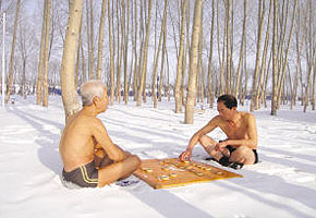 雪地上只穿短裤下棋的情形,您见过吗?16日10时许,在松原大桥附近江边雪地上,就上演了这刺激的一幕。市民张大爷和陈大爷赤裸上身,只穿短裤坐在雪地上下起象棋来。两位老人盘腿坐在一个木质大棋盘两边,地上是厚厚的白雪。