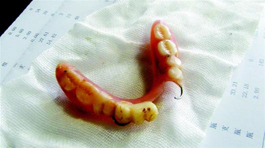 21日,记者驱车来到赤壁市罗晓秋老人家中,见到了取出来的假牙套。假牙套呈弧形,约有5厘米长,共镶有9颗假牙,牙套中还有一根用来固定假牙的细钢丝。