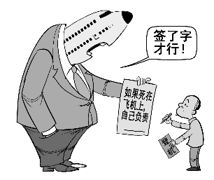 而在国外,航空业多是以人性化著称的,因为服务业本身就是窗口行业,理应更加珍惜自己的羽毛。如从2008年7月底起,所有欧盟机场都需对残障人士及老年旅客等行动不便者提供特别服务;而在加拿大的国内航班上有一个规矩,乘坐普通舱的大胖子或携带轮椅、拐杖的残疾人士,有权免费多占一个座位,航空公司不得因此而额外收费,或阻止这类特殊旅客登机,等等。这样的人性化之举,正是我们所缺失的,也是我们最该学习与借鉴的。只有人性化的服务意识深入人心了,“生死状”之类的闹剧才会就此终结。