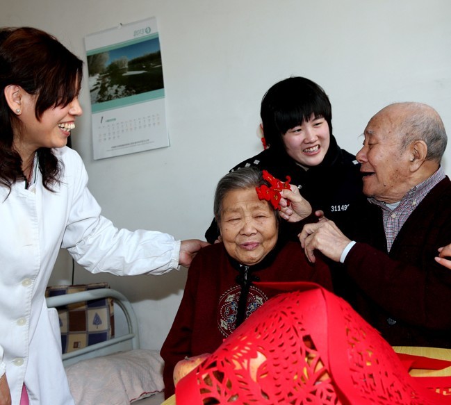 2月2日,公安红桥分局丁字沽派出所民警与在养老院居住的老夫妇聊家常。