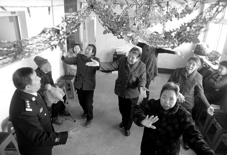 对口快板、蒙古族舞蹈、诗朗诵、独唱……就着一台插电的小音箱,大家一口气给老人们表演了好几个节目。台下坐着的82岁老人尚久明看得技痒,颤巍巍地要过麦克风,唱了自己最喜欢的京剧《空城计》选段。当爱唱歌的冯志国唱起《在那遥远的地方》时,杨秀珍、杨秀英、杨秀环三位老姊妹主动当起了伴舞。动作和舞步都是老人们即兴编的,简单而缓慢,但足以表达她们内心的快乐。唱完歌,冯志国拉住三位老人,认真地说:“二姑、三姑、老姑,你们才是最美丽的姑娘。”歌声、笑声、音乐声透窗而出,连看家护院的黑狗“好事”都寻着声音探头向屋里张望。