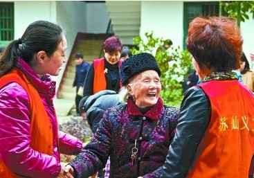 2月18日,85岁的雷起玉老奶奶拉着义工姑娘的手久久舍不得松开。当天,郴州市苏仙区文化局组织星星艺术团的演员和部分义工来到栖凤渡敬老院,与40名孤寡老人联欢。演员、义工与老人们拉家常、演节目、打扫卫生,送去新春的祝福与欢乐。