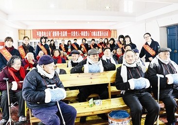 志愿者与敬老院老人一起