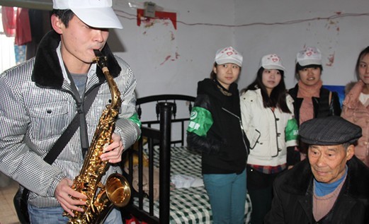 志愿者不仅给老人送去吃的、用的,还为老人煮上元宵,端上品尝,让老人过上快乐元宵节。志愿者还表演了节目。一曲悠扬的萨克斯《回家》让老人想起家人的陪伴,花鼓戏《刘海砍樵》让老人乐在其中,大家还一起同唱《新年好》、《东方红》、《没有共产党就没有新中国》等……