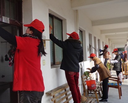 志愿者现场分成了两个小分队,主要负责擦拭东西走廊的门窗及老人们房间里卫生等。大家提着水桶拿着抹布就干劲十足的擦起来了。老人看着干净的窗说以后可以在窗前读报看书了。擦好门窗桌椅后志愿者还对敬老院里面的卫生死角、消防隐患进行了检查。随后,志愿者们在长廊上陪老人们拉拉家常,听听老人过去的故事,给他们讲讲现在社会上发生的实事,还询问老人的身体以及生活状况,了解他们在生活上的各项需要。
