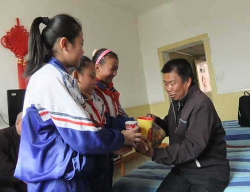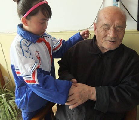 五年级三班的周思琪和华荣是一对好朋友,她们用自己的零花钱为老人买了营养麦片、八宝粥和水果,两个孩子还组织班上的女同学为老人们演唱了校歌。在五保老人魏金福的房间里,四年级的李雅楠一边给老人按摩一边聊着家里的事,说起父母带自己在银川上学,一年才能见一次爷爷奶奶,小雅楠伤心地哭了,魏金福老人拉着她的手安慰起来,“好孩子,别伤心,马上就能见到。”