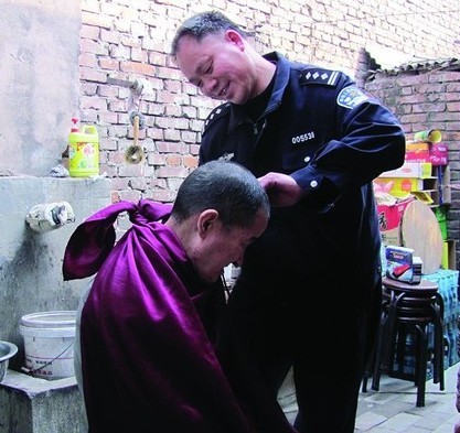 3月5日,石家庄市公安局桥东分局彭后街派出所民警李建民带着使用多年的理发用具,为生活不能自理的低保户刘建贵