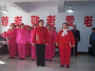 在敬老院前操场上,随着大红绸带的飞舞、节奏明快的鼓声,腰鼓队员带来的金鼓起舞、太阳花、秧歌舞、碧波满洋等腰鼓节目,使老人们大开眼界,高兴得合不拢嘴。
