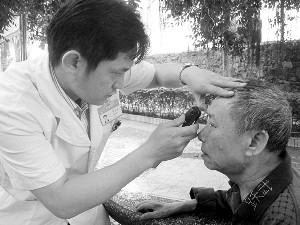海南眼科医院的医师正在给刘跃武做检查。