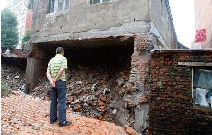 一位林姓的房主说,27日下了暴雨,他正睡觉时突然听到棚顶一声巨响,接着就是一阵石块砸房子的声音,他冒雨登梯子爬上房顶,看到对面楼底部墙体塌了砸在平房上。