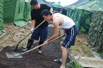 眉山军分区副司令员崔广成说,25日17时他带领官兵赶到清仁乡敬老院时,126名孤寡老人们正睡在床板铺成的地铺上,大家一看都很着急:“万一下雨怎么办?今天必须让老人们住进帐篷,睡在床上!”官兵们当即决定在附近的彩钢厂搭建帐篷,安置孤寡老人。晚上8时,一支30人的民兵突击队赶到敬老院工作。经过4小时奋战,棕垫、被褥全部铺好。