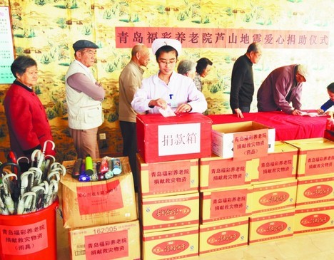 一方有难、八方支援,雅安地震发生后,青岛福彩养老院发起向地震灾区捐助救灾物资的活动。活动得到了广大党员干部职工和各公寓老人的积极响应。