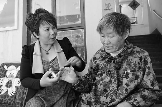 刘玉荣告诉记者,这位“妈妈”是从一个山坡下救回来的。刚开始,她的衣服里三层外三层穿着很多,而且破破烂烂,头发凌乱打着各种结,手指甲黑长黑长的。不会讲话,也听不到别人讲话,初步判断是位聋哑老人,由于老人不认字和老人交流起来很困难。不知道是哪里人,叫什么,家里还有什么亲人。不仅如此,老人的防备心理很重,刘玉荣想要帮她换洗衣服、洗澡,却被老人“张牙舞爪”地弄伤了手臂和脸。“我想了很多办法和她沟通,比如边脱她的衣服边拿新衣服示意她换新的,然后抓着她的手,让她亲眼看着我把脏衣服扔进洗衣机,让她等在洗衣机旁,等衣服洗好了,帮她晾衣服,该收衣服了,让她自己来收。相处,就是一个慢慢的过程吧,现在好多了。”刘玉荣聊着和这位“妈妈”的相处之道。