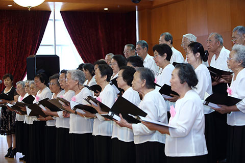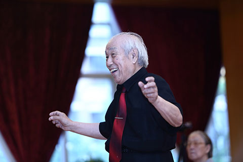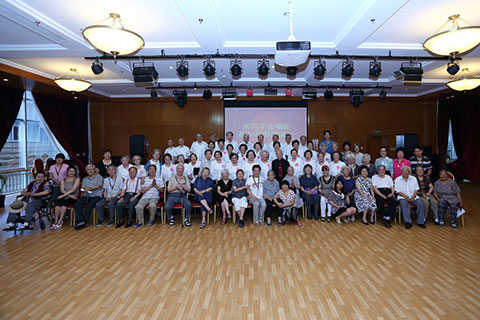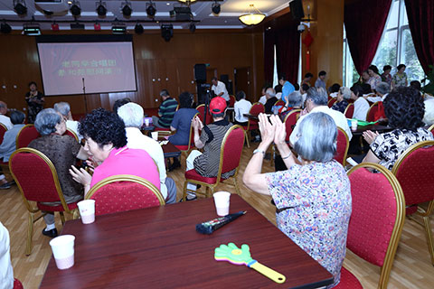下午15:30分,慰问演出准时开幕。这些上世纪四十年代的老大学生们,唱起了当年引导他们走上革命道路的歌曲,《松花江上》、《救亡进行曲》、《歌唱祖国》《莫斯科郊外的晚上》《大刀进行曲》等,并用诗朗诵加以串联,引起了现场观众席上众多老人的共鸣,台上的老人们精神抖擞,台下的老人热泪盈眶,你唱我和,一起在歌声中追忆曾经的流金岁月,这个时候,他们忘记了年龄,忘记了空间,在歌声中找到了当年意气风华的过往。一位老人家,以清歌加诗朗诵的形式,以及其乐观的语言描绘自己与歌相伴一生的境遇,即便是文革被打成右派的情形,也赋予宽厚幽默的语言,让现场老人笑中带泪。昨天的艰苦斗争,曾经的老当益壮,在歌声中他们延续着对于祖国的热爱、对生命的激情。台下的恭和苑员工无不被这满怀激情的歌唱深深打动,每次表演结束时都爆发出阵阵热烈的掌声,让全场所有人融合在共同的情感之中。慰问演出在全场齐唱《歌唱祖国》的歌声中结束,演出中那革命的精神、团结的气氛,将永久驻留在每一位与会者胸中。