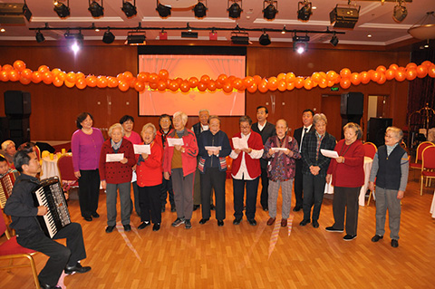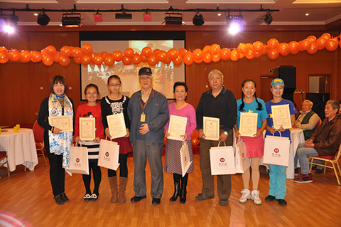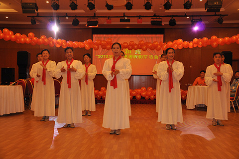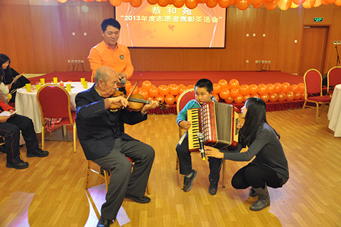 2013年11月16日,在北京双井恭和苑多功能厅内,温暖的烛光闪耀,多彩的气球轻摇,轻盈的音乐中,「恭和苑」“2013年度志愿者表彰茶话会”正在举行。此次茶话会是为了表彰这一年来到北京双井恭和苑的义工团体及个人,为这里的长者带来精彩的表演与贴心的温暖。表彰茶话会在知青合唱团一曲“美丽的草原我的家”中拉开了序幕。在接下来的颁奖环节中,由北京双井恭和苑苑内长者为获奖的团体及个人颁发奖项。不同于一般的获奖证书,此次获奖志愿者拿到的证书上有每一位苑内长者亲手签下的名字,一份心意,十分感激。年度特殊服务奖由刘少青爷爷为佳美口腔等四个团体颁奖;年度表演风格奖由号称“花仙子”的马奶奶为艺多Artplus 、九龙社区两团体颁发;年度最佳表演团体奖获得者分别是知青合唱团、老同学合唱团等,奖品是由“恭和学堂”书法小组的长者们亲自书写的对联。年度最佳小志愿者获奖者之一是梦想小朋友,为小梦想精心准备的奖品是一只可爱的大黄鸭。最后,由北京双井恭和苑院内长者自己组织的合唱团,在手风琴的伴奏下唱响"夕阳红"等歌曲,用深沉的歌声表达了自己对志愿者的感激之情和对生活的热爱。