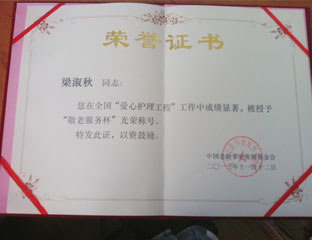 我院阳光楼护理组长梁淑秋在全国“爱心护理工程”工作中成绩显著,被授予“敬老服务杯”光荣称号。