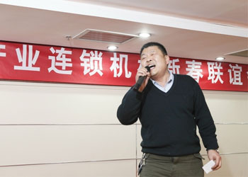 董事长兼总经理张先生正在做龙福宫年终总结和未来展望的讲话