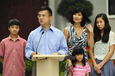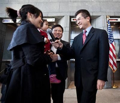 2011年8月14日,北京,新任美国驻华大使骆家辉携夫人李檬与三个孩子在官邸会见媒体并做简短致辞。