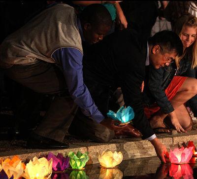 2011年9月11日,美国驻华大使馆举行“9.11”恐怖袭击事件十周年纪念活动,美国驻华大使骆家辉与部分美国在华公民一起根据中国的风俗点燃河灯以示悼念。