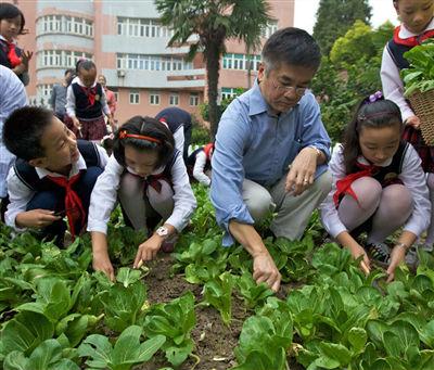 2011年10月12日,美国驻华大使骆家辉到访上海市金州小学,参观该校有机农庄,并与师生互动。