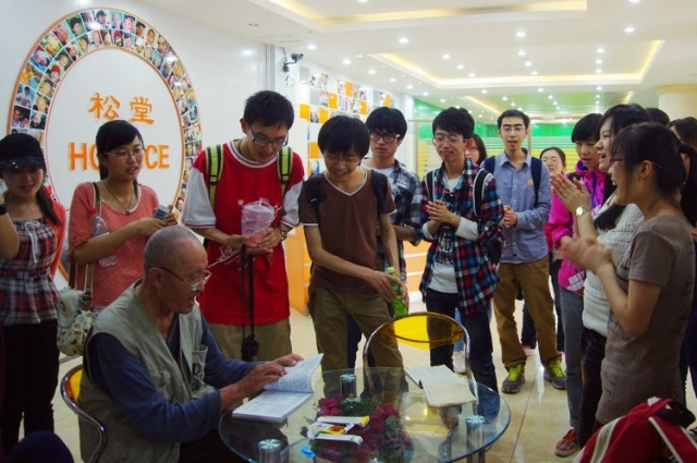 “老人家,您今年高寿。在这里还习惯么。”依偎在老人身边的是非通用语协会会长庞梦迪(09日语)。老人一边吃着西瓜,一边从容地应答着。
