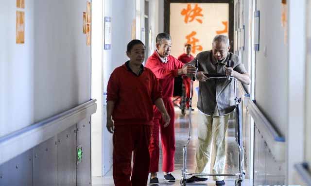 在松堂医院楼道中,一位老人在器械和医护人员的帮助下锻炼(9月29日摄)。 10月1日是联合国确定的“国际老年人日”,记者日前走访国内第一家临终关怀医院――中国老龄事业发展基金会北京松堂关怀医院。在这里,记者看到一张张来自老人、医护人员以及志愿者的笑脸和人们之间的相互关爱。
