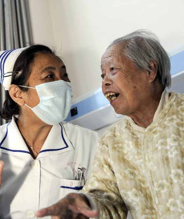 在松堂医院,见到袁护士长,一位老人立刻露出了笑容(9月29日摄)。 10月1日是联合国确定的“国际老年人日”,记者日前走访国内第一家临终关怀医院――中国老龄事业发展基金会北京松堂关怀医院。在这里,记者看到一张张来自老人、医护人员以及志愿者的笑脸和人们之间的相互关爱。