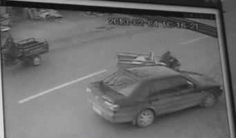 接到报警后,当地派出所民警也赶到了现场,经过调查,集市路口一个监控拍下了老人被撞过程。监控显示,2月4日上午10点16分,老人骑三轮车正往北拐弯,突然从东边驶来一辆黑色桑塔纳3000,撞上三轮车后,老人被甩了出去。