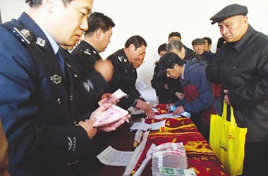 12月14日下午,专案组民警在白银四龙路派出所向受骗的60余名老人集中发放了追缴回来的赃款。面对失而复得的救命钱、养老钱,许多老人情不自禁地握着民警的手连声称谢,有人还把做好的大红锦旗亲自交到了民警手中,以表达感谢之情。