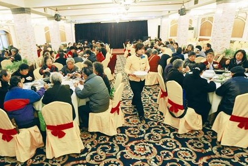 中午12时许,三场营销讲座分别结束,大部分老人走向二楼餐厅。营销公司的工作人员称,为老人们准备了数百元一桌的酒席,请大家免费享用。