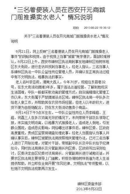 6月21日,华商网针对“西安卖水老人疑似遭城管殴打”事件进行了报道,碑林区委区政府现就此事做出回应,表示当事三人系公益性岗位人员,对此三人将立即开除;对中队负责人纪律处分;对局领导诫勉谈话,并上门向老人道歉,协调街办为老人生活提供帮助。
