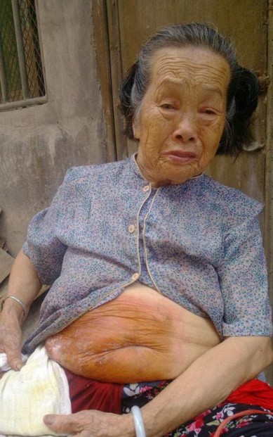 胡瑞兰的右侧髋骨长瘤,动手术后植了皮。她胸部以下全都红肿,有个部位溃烂出脓。为了防止它抖动疼痛,胡瑞兰用一块红布把它紧紧包住。她说,肚子溃烂部位常常疼得直发抖,每晚难以入眠,几乎只能睡一个小时。胡瑞兰从2008年年底就开始患皮肤病,因为没有完全根治,她今年3月份肚子又溃烂红肿,儿子们不闻不理,不带她去看医生,连医药费都不肯给她。胡瑞兰回忆,她去年皮肤溃烂在广州住院一个星期没有人去探望她。