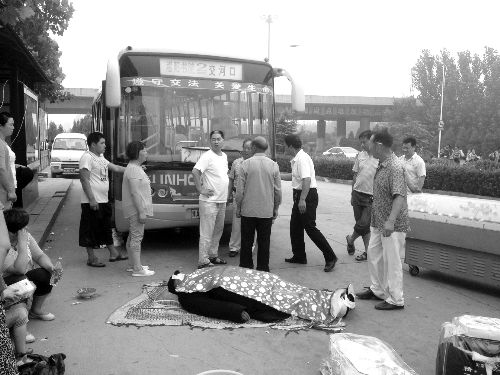 13日上午,记者在登封市交河口村公交站点附近,见到一辆2路公交车前围满了人。一位穿好寿衣的老人躺在车前,家属正与公交公司的人理论着。