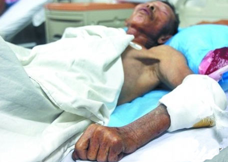 昨晚,记者在惠安县医院见到了被撞伤的郑春水。他躺在医院病床上,面容枯槁,瘦骨嶙峋,胳膊上缠着纱布,意识不是很清楚。郑国清告诉记者,大伯郑春水手臂被撞断,骨头突出皮肤,由于没有及时就医,现在已经腐烂,医生说可能要截肢,此外可能还有其他内伤。“他没有成家,就孤零零的一个人,这以后的日子还怎么过啊?”郑国清伤心地说。