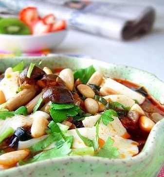 材料:超嫩豆腐一盒、裙带菜、蘑菇、胡萝卜、炒熟的松仁、芫荽、葱姜蒜。
