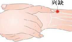 位置:两手虎口交叉相握,这时左手食指是在右腕的背部,而食指尖下就是列缺穴。
