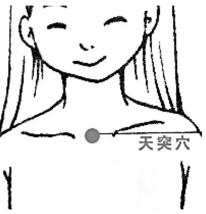 天突穴就在我们喉咙的下面,两锁骨中间凹陷的地方,一摸就能摸到。