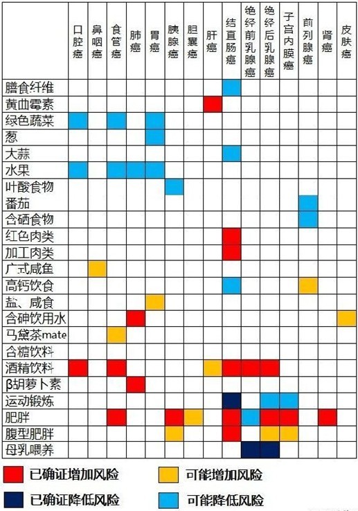 “吃什么食物能致癌”,“什么食物能防癌”,一直是备受大家关注的话题。近日,网络上一张“舌尖上的癌症”图谱迅速走红,短短几天内就被转发上千次。不仅普通老百姓关心,许多与健康有关的专业人士也纷纷转发,更有多家媒体对此做出报道。这张图谱的全名是《舌尖上的癌症:那些增加或降低肿瘤风险的食物》,一共列举了近20种食物和15种癌症的关系,分别用红色、黄色和蓝色显示食物增加或降低某种癌症风险的可能性。图谱上说得到底有没有道理,哪些可以让我们在生活中提高警惕?《生命时报》记者拿着这张图谱走访了多位权威肿瘤专家。