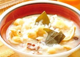 制作:用纱布包好葱白、狗肉、枸杞叶扎紧,粳米淘净,虾米水浸,再一同放入砂锅,加入适量清水煮粥,肉熟米烂成粥去除纱布包调味稍煮即成。