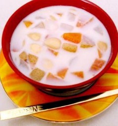 ⒋把牛奶加蛋液倒入装木瓜的碗里。