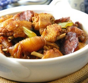 将鸡腿肉切块,加盐、米酒、姜丝抓匀,腌30分钟;香菇、冬笋切片、葱切段;魔芋经清洗浸泡,先用沸水烫过;汤锅中放水烧开,放入鸡块、葱段、冬笋,开锅后加盖闷煮20分钟;加入魔芋、香菇、青豌豆一起闷煮10分钟;加入鸡精、胡椒粉调味即成。