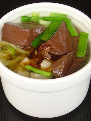 猪血:又称液体肉、血豆腐和血花等,味甘、苦,性温,有解毒清肠、补血美容的功效。猪血富含维生素B2、维生素C、蛋白质、铁、磷、钙、尼克酸等营养成分。猪血中的血浆蛋白被人体内的胃酸分解後,产生一种解毒、清肠分解物,能够与侵入人体内的粉尘、有害金属微粒发生化合反应,易於毒素排出体外。长期接触有毒有害粉尘的人,特别是每日驾驶车辆的司机,应多吃猪血。另外,猪血富含铁,对贫血而面色苍白者有改善作用,是排毒养颜的理想食物。